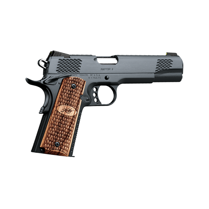 The Kimber Raptor pistol distinguishes itself with its distinctive combination of form and function, featuring aggressive slide and frame serrations that embody its fierce namesake. The zebra wood grips with a feathered Kimber logo and scaled texturing accents add a stylish touch while enhancing usability. With a brush-polished frame finish and chambered in .45 ACP, this full-sized pistol delivers exceptional performance with an 8+1 capacity. Its 5-inch barrel ensures precision, and the ambidextrous thumb safety provides versatility for all shooters. Dependability meets striking design in the patented features of this iconic Kimber firearm.