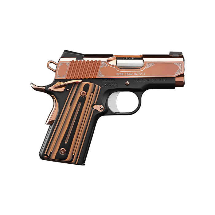 The Kimber Rose Gold Ultra II stands out as a distinctive personal defense firearm, merging exceptional performance with a bold, elegant design. Its vibrant rose gold finish with cut scroll engraving and border on the slide adds a luxurious aesthetic rarely seen in defensive handguns. Featuring a compact 3-inch barrel, an 8+1 capacity, and G10 grips, it delivers both practicality and precision. The KimPro Matte Black frame enhances durability, while the ambidextrous thumb safety ensures accessibility for all users. Chambered in 9mm, this pistol combines high functionality with striking visual appeal, making it a powerful yet stylish choice.