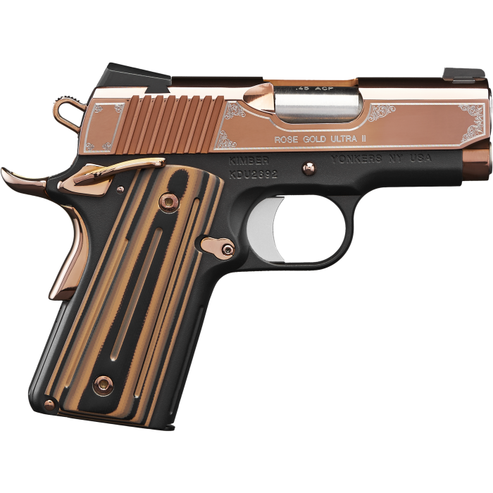 The Kimber Rose Gold Ultra II is an eye-catching fusion of elegance and tactical functionality, making it a standout choice for personal defense. Its distinctive KimPro Matte Black frame provides a rugged base that beautifully contrasts with the rose gold finish and intricate scroll engraving on the slide, offering an unparalleled aesthetic appeal. With a compact 3-inch barrel, chambered in the formidable .45 ACP caliber, and a carry-friendly 7+1 capacity, this handgun strikes a perfect balance between power and portability. The inclusion of ambidextrous thumb safety ensures ease of operation for both right- and left-handed shooters, while the durable G10 grips provide excellent control and comfort under any conditions. Perfect for those who value both performance and high-style craftsmanship, the Kimber Rose Gold Ultra II truly stands apart.