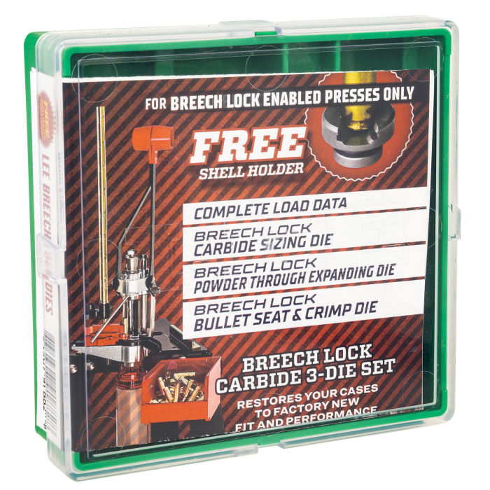 The Lee Precision Breech Lock 3-Die Set is designed to bring your 9mm Luger cases back to their original condition and functionality. This set includes three essential dies: a carbide sizing die, a powder through expanding die, and a bullet seating and crimping die. It also comes with a complimentary shell holder, ensuring you have everything needed for efficient reloading. This set is specifically crafted for presses equipped with a breech lock system, offering precision and reliability for your reloading needs.