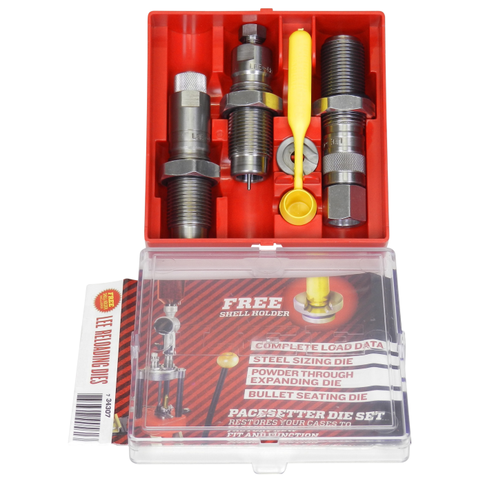 Lee's pacesetter 3-die set includes a full length sizing die, easy adjust dead length bullet seating die, factory crimp die, universal shell holder, powder dipper and instructions/load data.