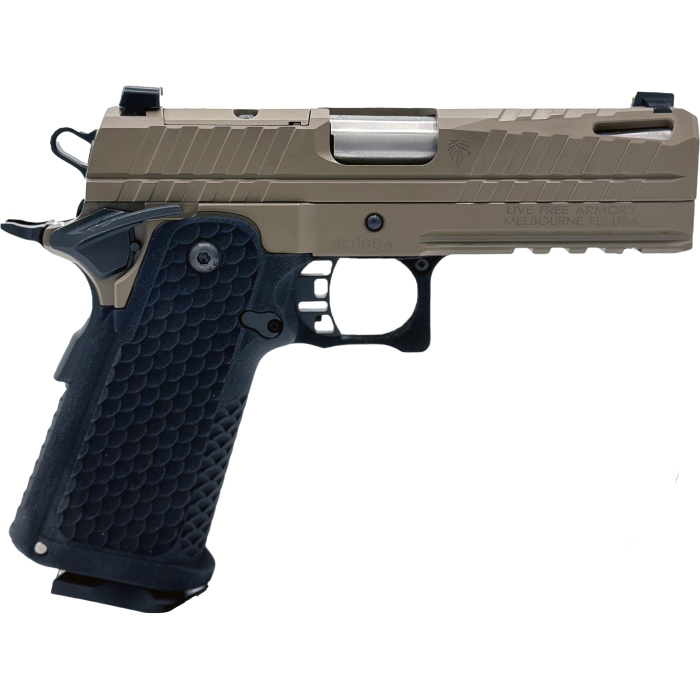 The Apollo 11 pistol by Live Free Armory is a masterpiece of engineering that merges durable craftsmanship with cutting-edge design. Its 416 stainless steel slide and 4140 steel frame provide unparalleled resilience, while the Elite Flat Dark Earth Cerakote finish ensures superior wear and corrosion resistance. The 4.15-inch rifle cut, match-grade bushingless bull barrel enhances accuracy and performance, paired with an innovative recoil reduction system for smooth shooting.