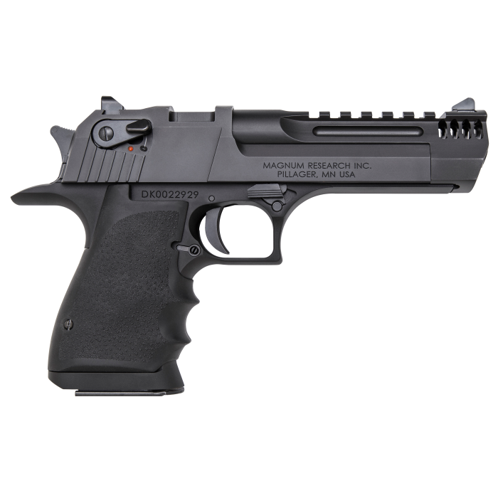 The new Mark XIX L5 in .357 Magnum is offered with an all new 5-inch barrel length and features a hard-coat anodized black aluminum frame, black carbon steel slide and barrel, and Hogue finger groove rubber grips. The pistol also has Magnum Research's widely popular integral muzzle brake. The new lighter version of this popular Desert Eagle .357 is 2 pounds 9 ounces which also makes it New York State compliant. Overall length is 9.75 inches, height is 6.25 inches, and the slide width is 1.25 inches.