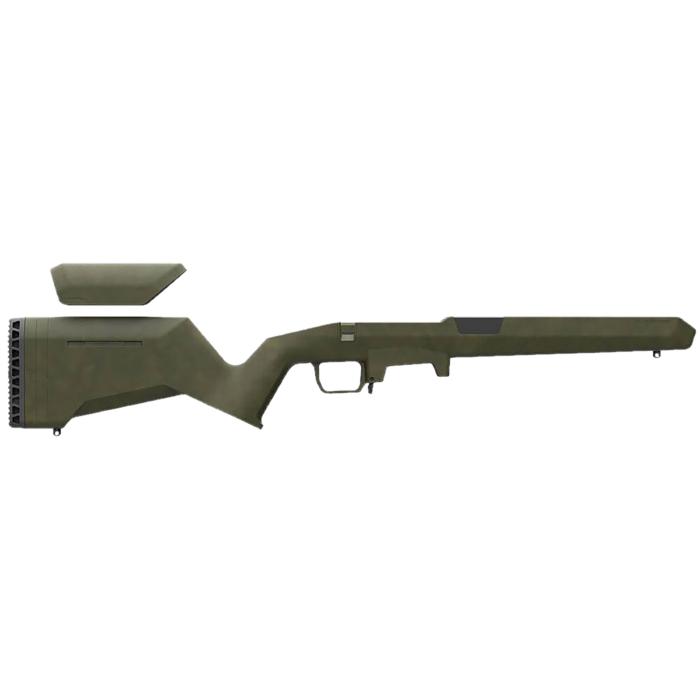 The Magpul Hunter Lite Remington 700 Short Action Stock in Green is expertly crafted for those who demand agility and precision in their hunting endeavors. Designed specifically for Remington 700 rifles in short-action calibers, this stock is a streamlined version of the original Hunter series, boasting a nearly 25% reduction in weight and a narrower forend. This makes it an ideal choice for hunters seeking enhanced maneuverability in the field. The stock can be easily converted for both right and left-handed use with interchangeable inserts. It features an aluminum V-bedding block and reinforced steel pillars for improved accuracy and consistency. Enhanced ergonomics are evident in the design, with integral sling swivel studs on the buttstock and forend for versatile sling and bipod attachment. The buttstock offers adjustable length of pull with removable half-inch spacers, and snap-on cheek risers allow for customizable comb height. The enlarged trigger guard ensures comfort and easy access to the ambidextrous magazine release, even when wearing gloves. Additionally, the magazine well includes stamped steel over-insertion tabs for reliable magazine positioning.