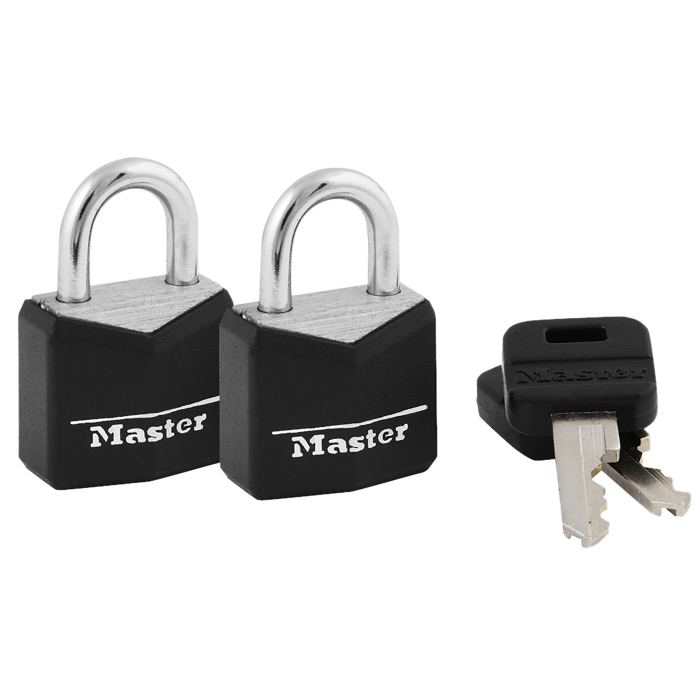 The Master Lock 121T Padlock set offers robust security with its durable steel construction, shielded by a black vinyl cover to resist scratches and corrosion. Each lock in the pack is designed with a 3-pin cylinder and a matching colored key head, ensuring ease of use and added convenience. The locks are keyed alike, meaning one key effortlessly opens both, providing a practical solution for securing multiple items. With a 0.75-inch wide body and a sturdy shackle, these padlocks deliver reliable protection against cutting and sawing, making them an ideal choice for safeguarding your valuables.