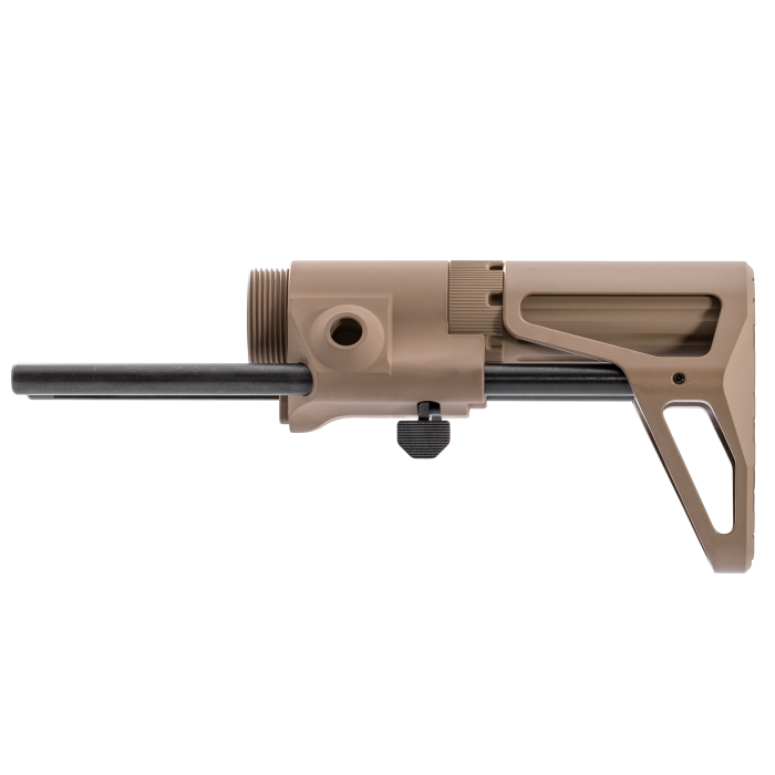 The Maxim CQB Stock for the AR-15 in Flat Dark Earth is designed to deliver unmatched comfort, durability, and versatility. At its most compact, it adds only 5.35 inches to your AR-15, making it ideal for tight spaces and maneuverability. When fully extended, it matches the length of a standard extended carbine stock, offering a familiar feel. With four adjustable positions, this stock ensures optimal comfort and adaptability for a variety of shooting scenarios. Built from durable aluminum with a sleek Flat Dark Earth finish, the Maxim CQB Stock combines functionality with a rugged, modern aesthetic.