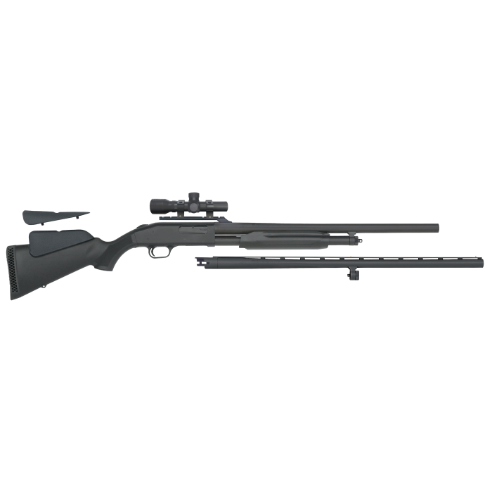 This mossberg 500 field/deer combo features a black synthetic dual comb stock with a blued metal finish.This 12 gauge combo comes with two barrels: a 24" fully rifled barrel and a 28" vent rib barrel with bead sights.It is equipped with a 3" chamber, includes an accu-set of choke tubes, and comes with a dead ringer 2.5x20mm scope.