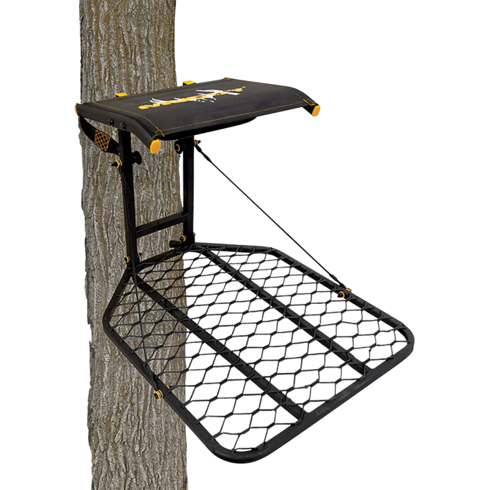 Experience the ultimate in hunting comfort and versatility with the Muddy Boss HangOn Stand. Designed with a FlexTek seat that easily flips back, it allows for maximum use of the spacious steel platform, ensuring you have ample room for movement. The innovative Silent Strap System eliminates metal-to-metal contact, providing a quiet and stealthy setup. With a generous 24-inch by 30-inch foot platform, this stand offers a stable and secure footing, supporting up to 300 pounds. Its sleek black design blends seamlessly into any environment, making it the ideal choice for serious hunters.