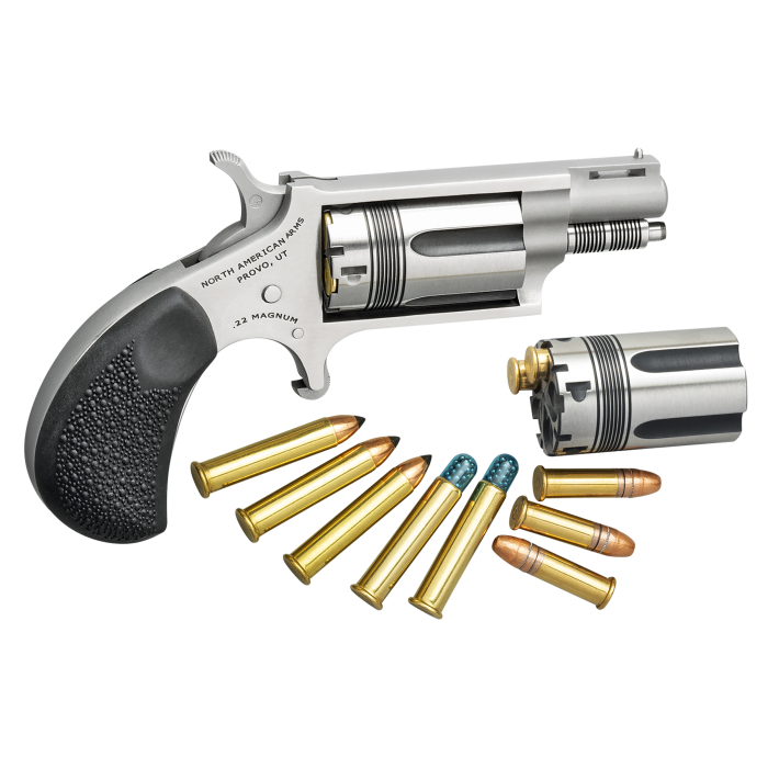 The wasp 22 magnum mini-revolver is a great concealed carry pocket gun.The 22 magnum cylinder can be used with all popular.22 magnum ammunition, including.22 magnum shot shells.This model comes with a special 22lr conversion cylinder made longer to easily fit in the.22 magnum mini-revolver.The wasp has black pebble-textured rubber grip, a 1.625" barrel with a vent bar, and a bead front sight.It weighs 6.5 oz and has a 5-shot capacity.Using the half-way notch cylinder, the hammer may rest safely and securely away from live or empty chambers without chance of accidental discharge.