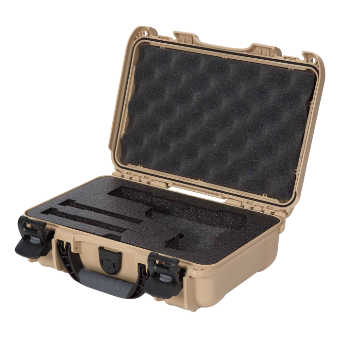 The Nanuk 909 Classic Gun Case in tan is designed for ultimate protection and organization of your firearm. Its high-quality grade closed cell PEF foam construction in the base and soft cushioned foam in the lid ensure long-term performance and safety. Featuring an indestructible and waterproof NK7 resin shell, this case is built to withstand tough conditions. The PowerClaw superior latching system provides added security, while the interior offers secure storage for many popular handgun models along with space for two single stack magazines or one double stack magazine. Additionally, it is airline approved for convenient travel.