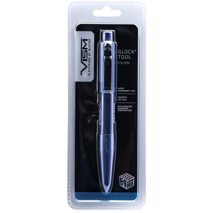 The NcSTAR Tactical Glock Disassembly and Front Sight Tool features a pen-style design with a 2.5mm punch tool for removing pins and disassembling Glock frames, slides, and magazines. The 3/16" hex nut driver on the opposite end is magnetized for secure front sight screw handling. Compact at 3.40" long and 4 oz, it is perfect for maintaining Glock pistols and aftermarket components.