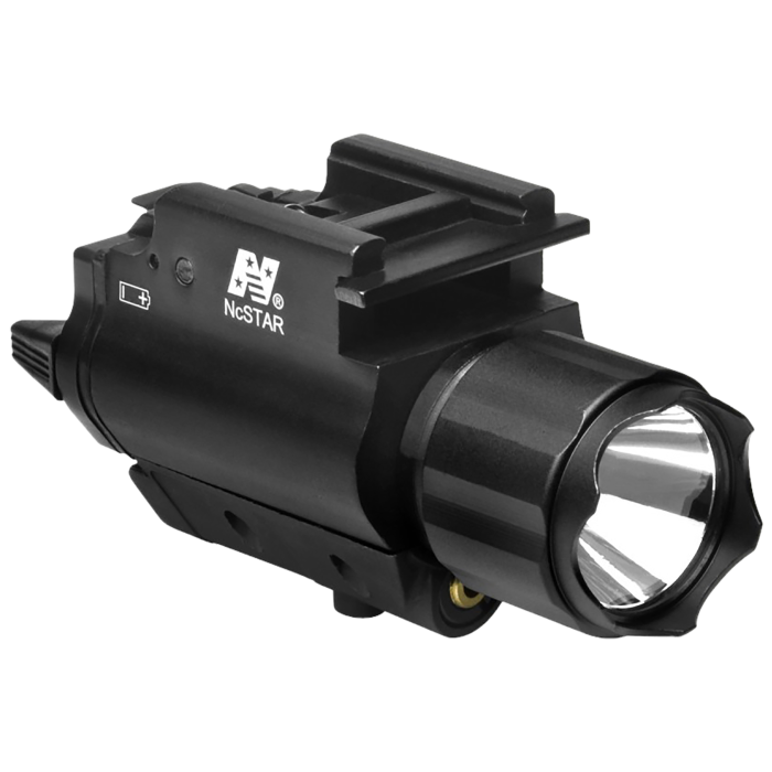 Compact and durable, the NcSTAR Flashlight Green Laser Combo features a black anodized aluminum build with a powerful 200-lumen Cree LED and bright 532nM green laser. Its ambidextrous switch offers momentary or constant operation, with a rear selector for three modes: laser, flashlight, or both. Equipped with a quick-release mount for Picatinny/Weaver rails, it's lightweight at 4 oz and powered by included CR123A batteries.