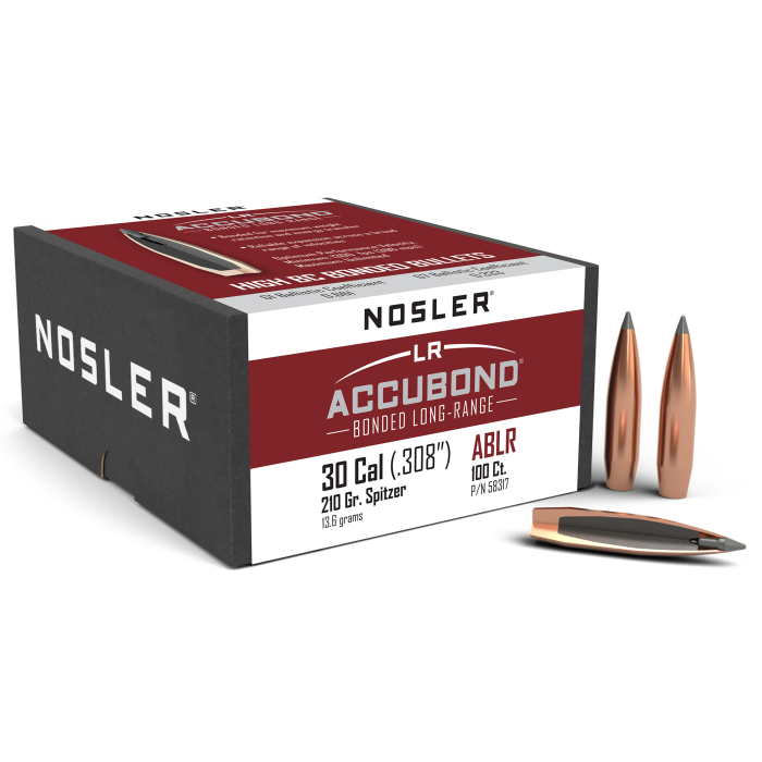 The Nosler Accubond LR 30 Caliber Spitzer bullet is designed for those who demand superior performance at extended ranges. With a substantial 210-grain weight, this bullet offers exceptional energy retention and penetration. The Spitzer design enhances aerodynamic efficiency, ensuring a flatter trajectory and improved accuracy. Ideal for long-range hunting or target shooting, this box of 100 bullets is a reliable choice for precision shooters seeking consistent results from their .308 caliber firearms.