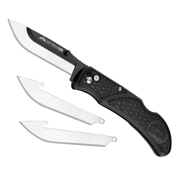 The onyx-lite from outdoor edge has a durable one-piece grivory polymer handle and distinct non-slip trimond texture pattern.Part of the razor-lite series, it is one of the sharpest, strongest replacement razor-blade knives with safe, easy blade changes at the push of a button.The black-oxide coated blade holder supports the razor for the strength of a standard knife and sharpness of a surgeon's scalpel.It comes complete with an ambidextrous thumb opener, pocket clip and three replacement blades.