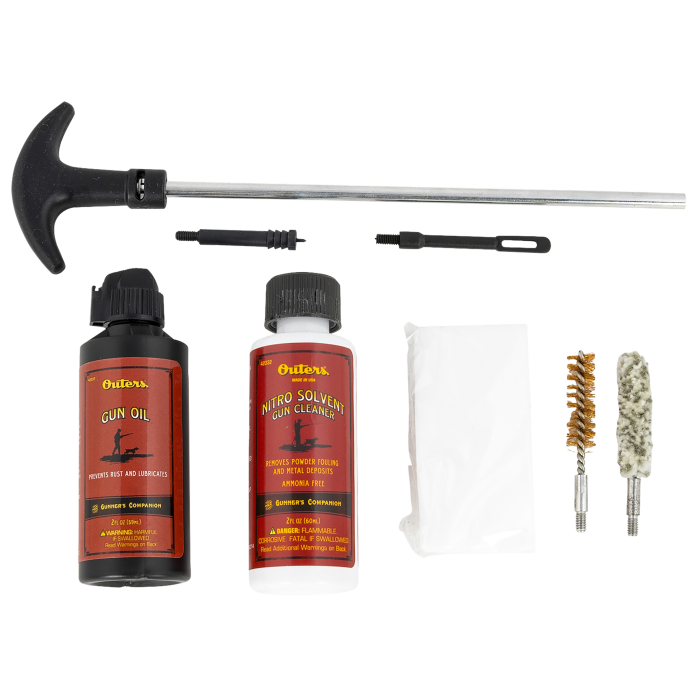 The Outers Aluminum Rod Pistol Cleaning Kit is a comprehensive solution designed for precision maintenance of 9mm, .38, and .357 caliber pistols. This kit features a durable aluminum rod that ensures easy handling and effective cleaning. Equipped with a phosphor bronze bore brush and a wool blend mop, it effectively removes residue and debris. The kit also includes a spear-pointed jag and a slotted patch loop, paired with microfiber absorbent patches to ensure thorough cleaning. Enhance your firearm care routine with the included Nitro Solvent Gun Cleaner and Gun Oil, each in a convenient 2oz bottle, delivering optimal performance and protection for your pistol.