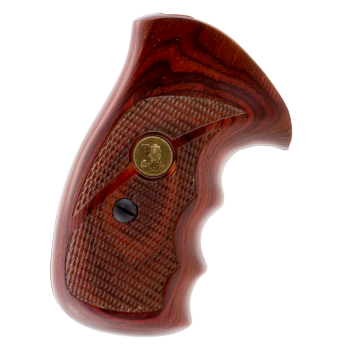 Enhance the performance and aesthetics of your Smith & Wesson K/L frame revolver with the Pachmayr Renegade Rosewood Laminate Grips. These deluxe grip panels feature precision CNC cut checkering, offering superior control and a secure hold. Crafted from high-quality laminate material, the grips boast a striking Rosewood finish, adding timeless elegance to your firearm. With an integrated medallion, these grips seamlessly blend style and functionality, making them an ideal choice for revolver enthusiasts seeking both comfort and classic appeal.
