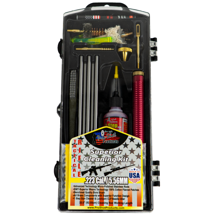 Maintain your AR15 rifle with the ProShot Tactical Classic Cleaning Kit, designed specifically for .223/5.56mm calibers. This kit includes a durable black plastic case packed with essential cleaning tools, including nylon bristle brushes for thorough maintenance without damaging your firearm. The slotted tip ensures easy application of cleaner and oil, while the universal #8-32 thread pattern accommodates various accessories. Ideal for both 223 Remington and 5.56 NATO calibers, this kit is perfect for keeping your firearm in top condition.