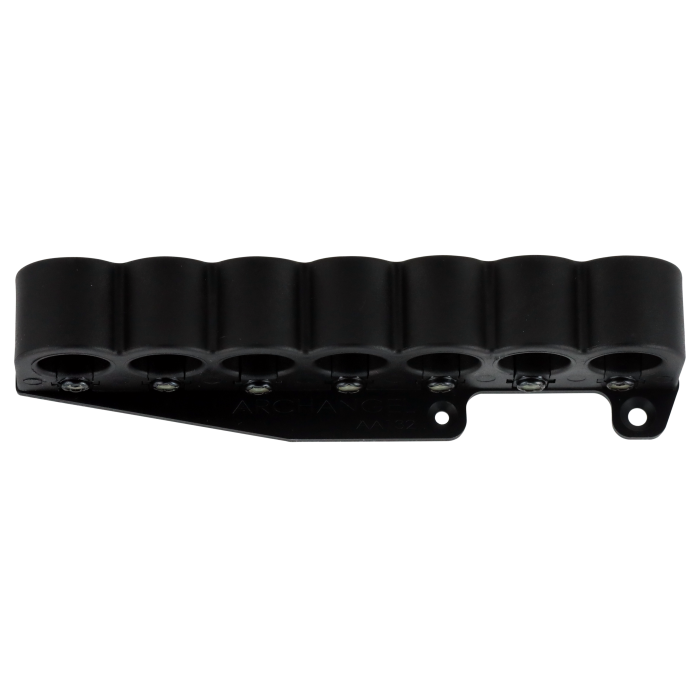 The ProMag Archangel 20GA Shell Carrier in black is a game-changer for Remington 870 shotguns, offering a secure 7-round capacity for 20-gauge shells. Its innovative retention adjustment system lets you fine-tune the tension for precise compatibility with your ammo and preferred retention levels. Designed with a rubber molded gasket, it protects your firearm's finish while ensuring durability and stability. The carrier’s clever design prevents interference with the pump action, even when used with military-length forends. Constructed from rugged polymer with an aluminum mounting plate, this USA-made shell holder is the ideal upgrade for reliability and practicality.