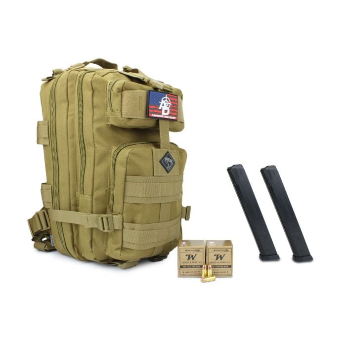 RTAC Backpack Bundle w/Winchester Service Grade 9mm 115 Gr FMJ (100 Rounds) + RTAC 9mm 34 Rd Magazines Designed for Glock Pattern Firearms (2)