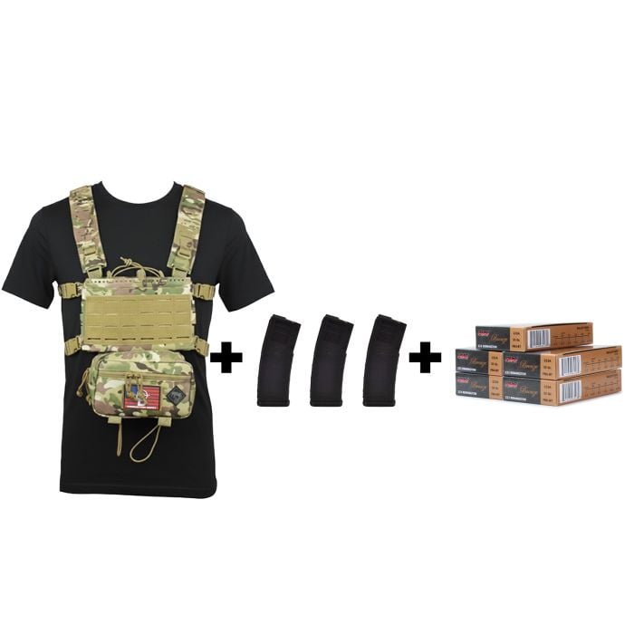 This complete range-ready bundle combines essential tactical gear with premium ammunition for immediate training or field use. The package centers around the Rattlesnake Tactical Micro Chest Rig , paired with three Magpul PMAG Gen M2 MOE 30-round magazines and 100 rounds of PMC Bronze 223 Remington ammunition, providing everything needed for extended shooting sessions right out of the box.