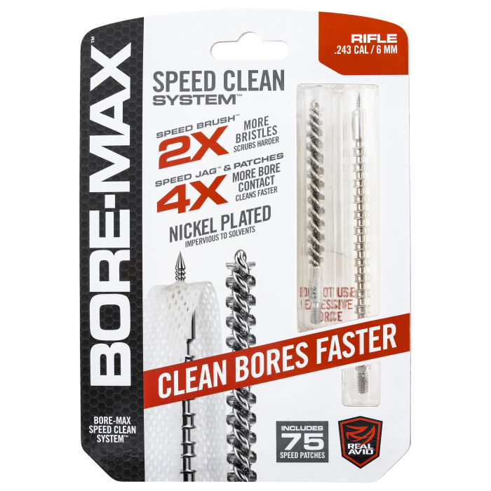 Experience unparalleled efficiency with the Real Avid BoreMax Speed Clean System for your .243 caliber rifle. This innovative cleaning kit ensures maximum bore contact, thanks to its precisely sized Speed Jag and Speed Jag patches. The nickel-plated jag and brush resist solvents, providing durability and reliability in every use. Packaged in a convenient blister pack, this set includes 75 patches, a Speed Brush, and a Speed Jag, making it an essential addition to any rifle maintenance routine.