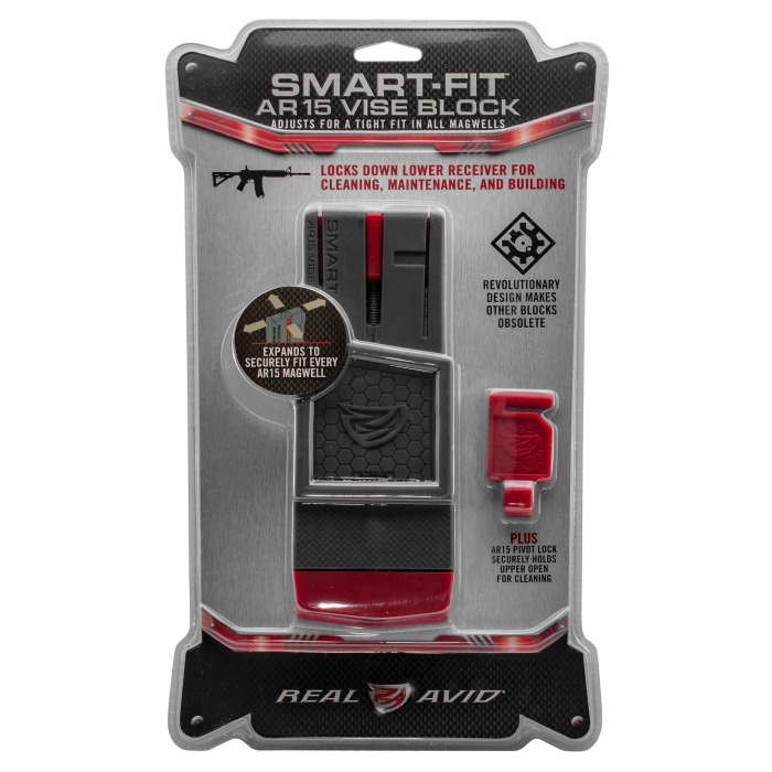 The Real Avid Smart-Fit Vise Block in Gray and Red is a versatile tool essential for any AR15 enthusiast. Crafted from durable polymer, this vise block is designed to fit seamlessly into any AR15 magazine well, providing a stable platform for maintenance tasks. Whether you're swapping out buffer tubes or adjusting fixed stock receiver extensions, the Smart-Fit Vise Block offers a customizable fit with its easy-to-use adjustment handle. Additionally, its innovative design allows compatibility with inverted lower receivers, facilitating work on pistol grips or access to the AR15's underside. The included Pivot Lock secures the firearm in an open position, simplifying cleaning and maintenance of the chamber and barrel. Upgrade your gunsmithing tools with this reliable and adaptable vise block, tailored for precision and ease of use.