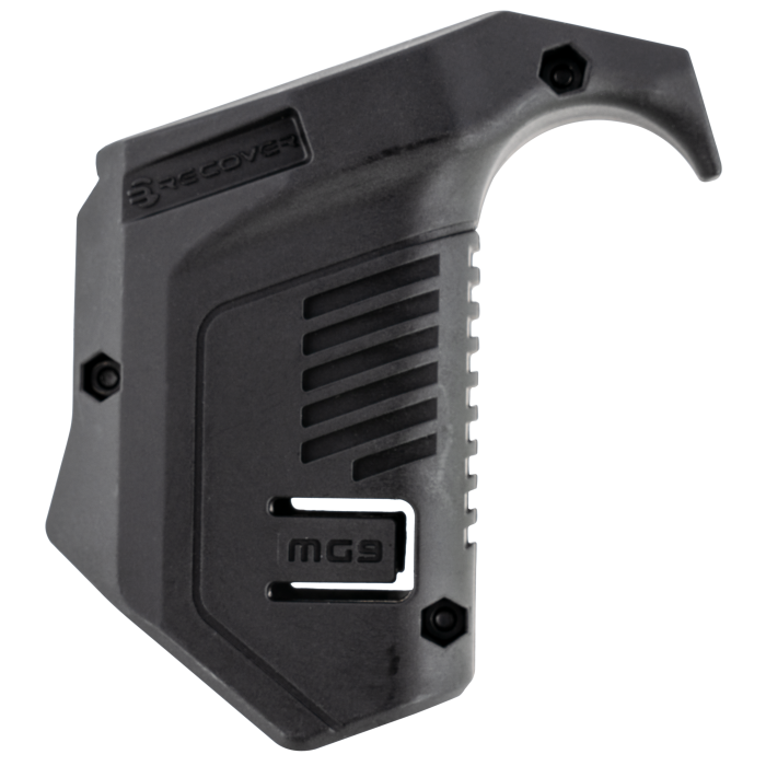 The Recover Tactical MG9 Angled Mag Pouch in black polymer is designed for easy and efficient magazine access. Its ergonomic slanted design includes a secure locking push button for quick mounting and an integrated holder with retention for swift magazine changes. This mag pouch offers a universal fit for any platform equipped with a Picatinny rail and is compatible with Glock magazines.