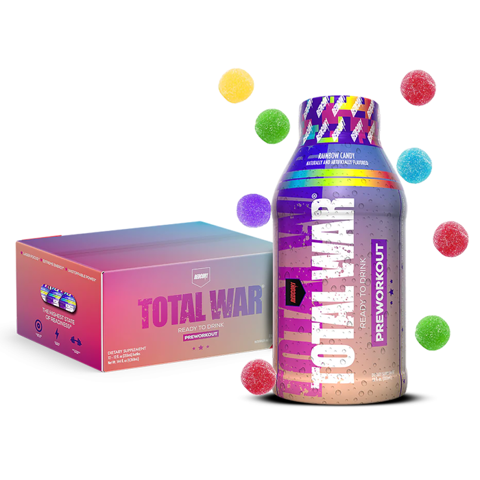 Experience a powerful pre-workout boost with Redcon1 Total War Ready to Drink in Rainbow Candy flavor. This convenient 12-pack offers a fully dosed blend designed for endurance, energy, and focus. Total War RTD combines 365mg of Caffeine, 3.2g of Beta Alanine, 1g of Taurine, and 6g of Citrulline Malate, providing the same benefits as the powder form but in a handy on-the-go format. Perfect for those seeking enhanced performance and a quick energy boost before workouts.