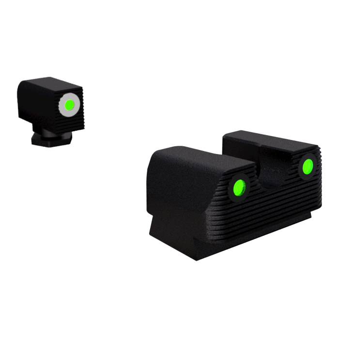 This set of night sights is crafted for precision in any lighting condition, enhancing your shooting experience with your Glock. Engineered from durable steel, these sights offer a reliable green glow from the tritium inserts, ensuring visibility in low light and complete darkness. During the day, the front sight's white outline and the rear's black outline provide clear contrast, allowing for quick target acquisition. Compatible with a wide range of Glock models, this standard height sight set is a blend of robust construction and meticulous design, perfect for both everyday carry and professional use.
