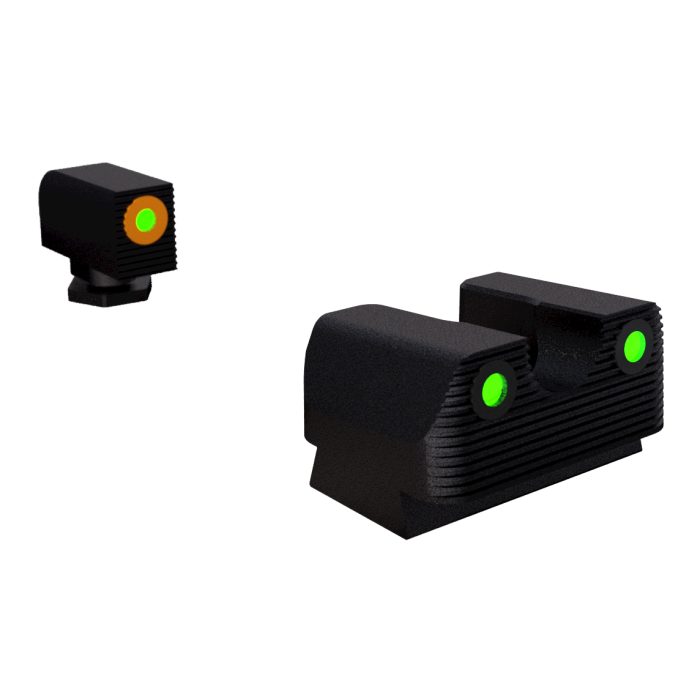 Enhance your shooting precision with these night sights crafted specifically for Glock models 42, 43, 43X, and 48. Designed for optimal performance in low-light conditions, the tritium elements provide a reliable green glow, ensuring you maintain accuracy even in complete darkness. During daylight, the bright front dot in orange and a U-notch rear design improve target acquisition speed and precision. The sturdy steel frame is CNC-machined to ensure durability and features a snag-resistant design, offering both resilience and seamless integration with your firearm.