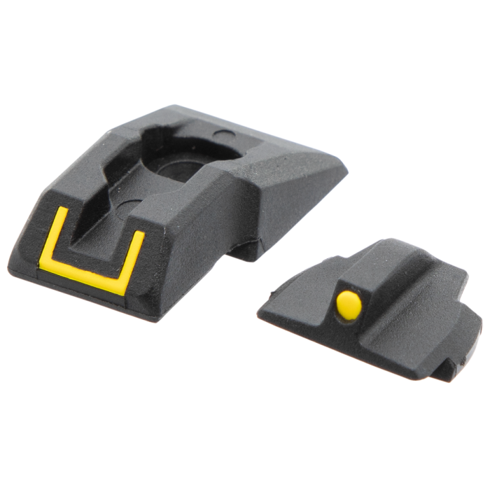 Enhance your shooting accuracy with this sight set designed exclusively for Ruger Security-9 and Security-380 pistols. Crafted from durable molded polymer, this set features a contrasting black and yellow color scheme for both the front and rear sights. The square dot front sight and U-notch rear sight configuration allow for quick and precise target acquisition. With vibrant orange inserts, this sight set ensures improved target tracking and sight alignment, making it a reliable choice for any shooting enthusiast. Made proudly in the USA, this accessory is tailored to fit seamlessly on your firearm, elevating your shooting experience.