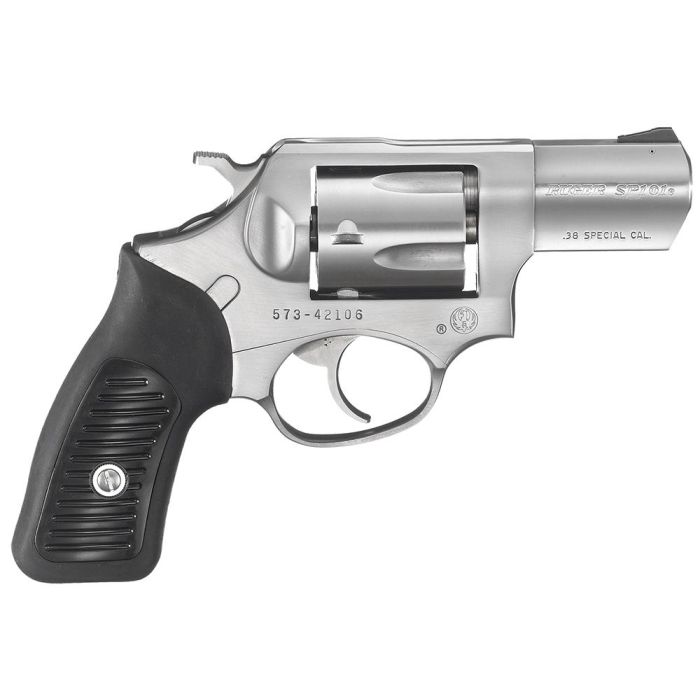 The Ruger SP101 revolver features a smaller Ruger cushioned grip system with no exposed metal at the back strap for shooter comfort. The patented triple locking cylinder mechanism securely locks the cylinder into the frame at the front, rear, and bottom. Its stainless steel frame has no weakening side plates.