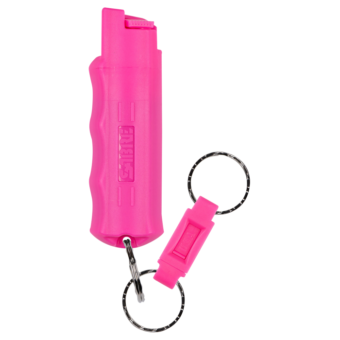 Introducing the SABRE Pepper Spray with Finger Grip and Key Ring, a reliable companion for personal safety that empowers with confidence and peace of mind. Designed with precision and practicality in mind, this pepper spray offers 25 bursts, ensuring readiness against multiple potential threats. Its powerful stream minimizes wind blowback, providing protection from a distance with a range of 10 feet. Enhanced with UV marking dye, it aids in the identification of an attacker by authorities after an incident. The ergonomic finger grip design allows for precise aim and intuitive hand alignment, facilitating faster deployment without having to divert attention from the threat. Safety is paramount, and the twist lock mechanism ensures accidental discharges are avoided while stored in bags or purses. For those on the go, the Quick Release with detachable key chain provides immediate access and effortless attachment to a keychain, enhancing portability. This product not only prioritizes safety but also supports a worthy cause, as purchasing the HCNBCF02 contributes directly to the National Breast Cancer Foundation. Available in a striking pink color, this pepper spray is both a statement of personal empowerment and a tool for protection.