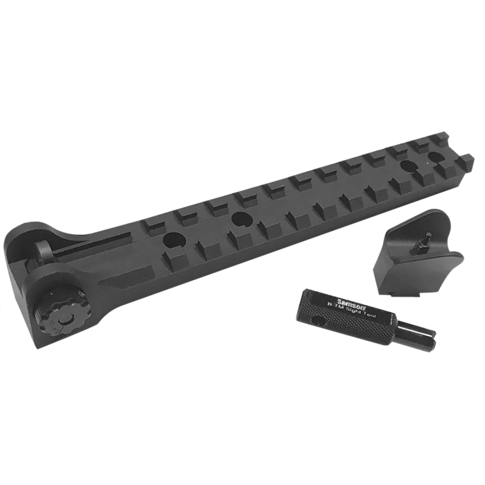 The Samson B-TM Sight Package for the Ruger 10/22 offers an elevated sight picture for enhanced shooting comfort. Designed for a more natural cheek weld, these sights elevate the height over bore to 1.25 inches, surpassing the standard factory iron sights. The rear aperture sight, which mounts easily to the factory tapped holes, is fully adjustable for windage and includes protective shoulders. Additionally, it features a Picatinny rail section, allowing for co-witnessing with optics. The winged front sight is crafted from durable steel and is adjustable for elevation, requiring a factory dovetail barrel for installation. With its robust 6061-T6 aluminum frame, this sight package combines precision with durability, making it an essential upgrade for your Ruger 10/22.