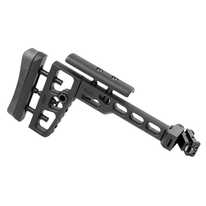 The Samson Tactical Folding Stock with Picatinny Adapter stands at the forefront of tactical enhancement, offering a blend of precision engineering and unmatched functionality. Designed for those who prioritize agility and adaptability, this folding stock requires no tools for adjustment, enabling quick and effortless configuration with a simple pushbutton. Made from robust 6061 T6 Aluminum, it promises durability while maintaining a lightweight, skeletonized structure to minimize bulk. This allows your firearm to retain a streamlined profile without sacrificing performance. Perfect for tactical enthusiasts seeking a high-performance upgrade, the S.A.S delivers swift adaptability, transforming your firearm into a compact powerhouse when needed. Elevate your tactical capabilities with this expertly crafted folding stock.