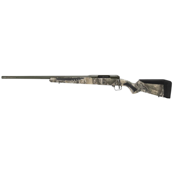 The Savage 110 Timberline rifle is designed for precision and adaptability, featuring a 24-inch fluted barrel that enhances accuracy and an omni-port muzzle brake for reduced recoil. The left-hand bolt action is integrated into the AccuStock with an internal chassis, providing a stable platform throughout its length. With the AccuFit system, hunters can easily adjust the length of pull and comb height, ensuring a tailored fit with the natural camo stock. The rifle's 6.5 PRC caliber offers a 3+1 capacity, while the adjustable AccuTrigger ensures a clean and precise pull. Weighing 8.50 lbs, it is robust yet manageable, and the OD Green Cerakote finish on the barrel and receiver offers superior protection against the elements, making it ideal for challenging environments.
