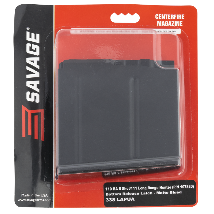 This Savage Arms magazine is designed specifically for the 110BA model and accommodates the powerful 338 Lapua Magnum caliber. Crafted from durable steel with a sleek blued finish, it offers a reliable 5-round capacity. This detachable magazine ensures smooth feeding and enhances the performance of your rifle, making it an essential accessory for any shooting enthusiast.