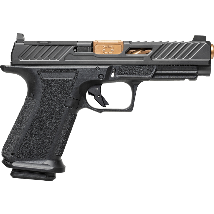 The Shadow Systems MR920L 9mm is a precision-engineered compact pistol tailored for optimal performance and adaptability. Featuring a 4.50-inch match-grade, spiral-fluted barrel and a 15+1 capacity, this firearm offers superior accuracy and extended use. Designed with configurable ergonomics, the MR920L includes interchangeable backstraps for a customized grip angle, ensuring a natural point of aim. Its extended beavertail and aggressive trigger guard undercut significantly reduce recoil, enhancing control during rapid fire. The wraparound grip texture provides a secure hold without compromising comfort for daily carry. Equipped with an optic cut slide, it supports mini red dot optics from major brands, directly mounting without the need for additional plates. The striker-fired action, combined with a drop-safe, flat-faced aluminum trigger, delivers a crisp tactile reset for quick follow-up shots. Finished in sleek black, the MR920L includes a tritium night sight front and black serrated rear for precise targeting in low light conditions.