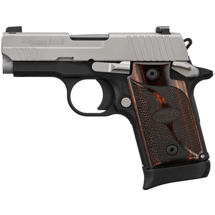 The Sig Sauer P938 is a compact powerhouse, delivering the impressive performance of a 9mm cartridge in a sleek, easily concealable design. Its single action only trigger ensures a smooth shooting experience, akin to larger models, while maintaining a discreet profile. Equipped with elegant Rosewood Hogue grip panels, the P938 offers superior handling and style. The SIG Lite day/night sights enhance visibility in varying light conditions, providing shooters with confidence and precision. Designed with ambidextrous thumb safeties, a familiar magazine release, and slide stop lever, this pistol ensures intuitive operation for all users. The P938 includes both a 6-round and a 7-round magazine, allowing for flexibility in capacity. Its black anodized frame finish and serrated slide add to its robust functionality and aesthetic appeal.
