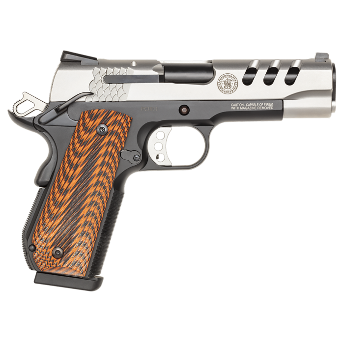 Smith & wesson's performance center combines old world hand craftsmanship with modern technology to create an extremely accurate, high performance model designed for the most demanding shooters.The 1911 features a performance center action, throated barrel with a precision crowned muzzle, ambidextrous frame safety, and a ported slide with lighting cuts to reduce weight and recoil.This model has g10 custom wood grips, two-tone scandium alloy frame, and a 4.25" barrel.
