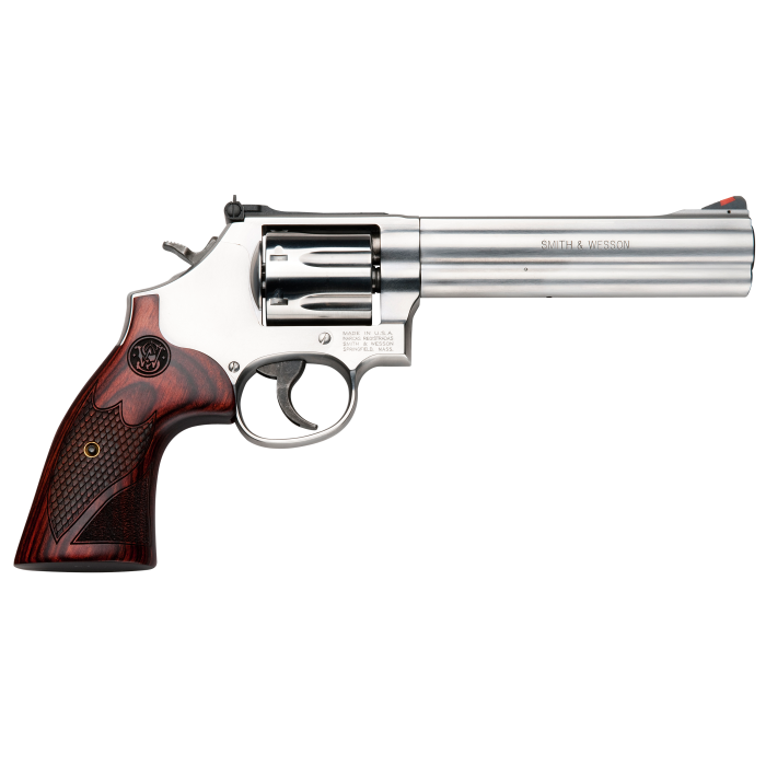 The Smith & Wesson Model 686 revolver is a true workhorse for both duty and sporting use. With a major effect on both law enforcement and sporting markets the 686 has become one of the most popular revolvers ever made. This 7 round revolver comes equipped with a wood grip stainless steel barrel cylinder and frame finish.