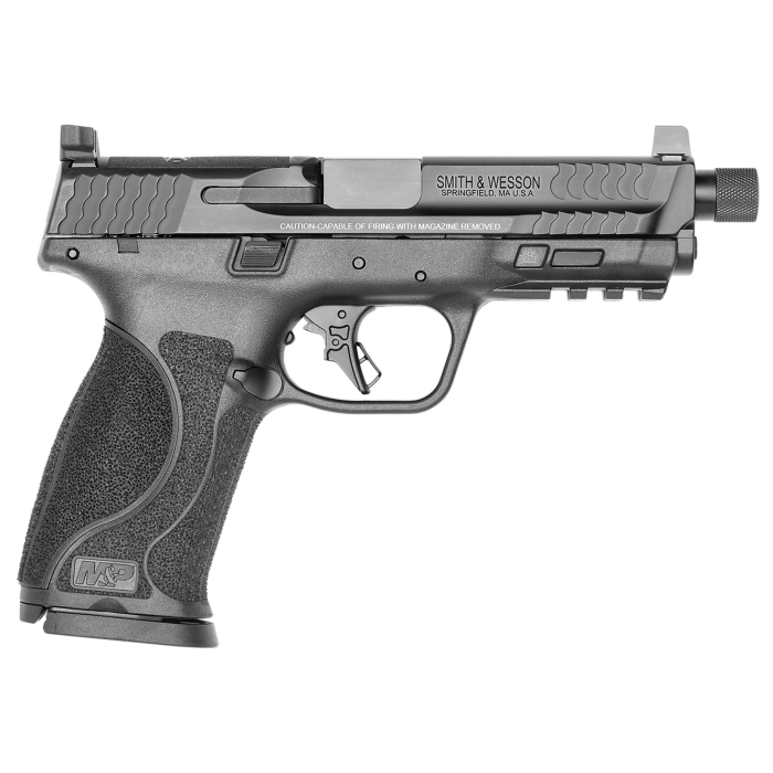 It features an improved trigger, enhanced grip texture and interchangeable palmswell grip inserts to accommodate a variety of users. Other features include a 4.625" threaded barrel, optics ready slide, M2.0 flat-face trigger, and two 17-round magazines.