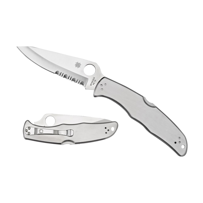 The Spyderco Endura 4 Stainless Steel Folding Knife features a VG-10 stainless steel saber-ground blade with a convenient thumb hole for reliable one-handed opening. Its satin-finished stainless-steel handle, chamfered for comfort, enhances strength and durability. The back lock mechanism ensures secure use, while the hourglass clip offers versatile carry options. Closed length is 4.92”, blade length is 3.85”, and it weighs 5.60 oz.