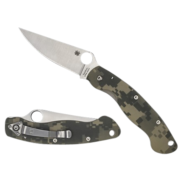 The Spyderco Military Model C36 Camo CPM S30V Folding Knife is a high-performance, lightweight tool designed for hard use. It features a 4-inch CPM S30V clip-point blade praised for edge retention and rust resistance, a 5.5-inch handle with durable digital camo G-10 scales, and a secure liner lock. With a 9.5-inch overall length, 4.5 oz weight, and quick operational thumb hole, it's ideal for demanding tasks, ensuring strength and precision in every cut.