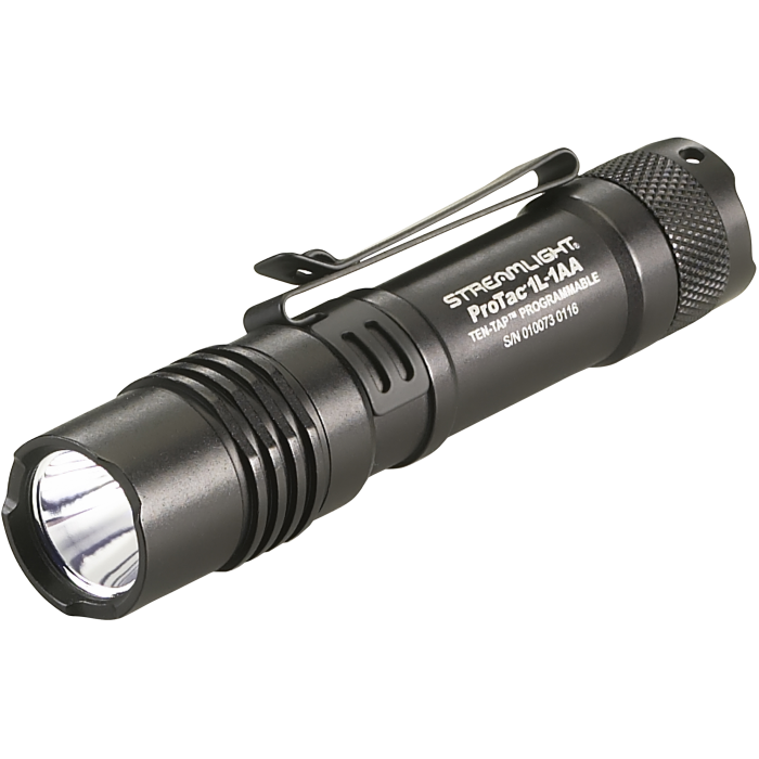 Compact and versatile, the Streamlight ProTac 1L Dual Fuel Flashlight features a durable black anodized aluminum body, impact-resistance, and waterproof design. Powered by a lithium or alkaline battery, it delivers 350 lumens max with C4 LED technology. Ten-Tap programming offers strobe, high, and low modes, while the removable pocket clip and holster ensure easy carry.