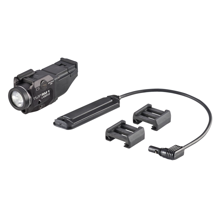 The Streamlight Black Anodized Laser LED Rail Mount is engineered for performance and precision. With its low-profile TLR RM 1 Laser, it offers an extended reach and a focused beam, thanks to the HPL face cap. This design enhances candela while maintaining a powerful 500-lumen output. Its ambidextrous push-button and remote pressure switches ensure reliable operation, allowing for seamless transitions between laser, light, or laser-light modes. Crafted from durable 6000 Series Aluminum, this mount is both lightweight at 3.24 oz and IPX4 water-resistant, making it suitable for various environments. The one-handed snap-on and tighten interface simplifies attachment, and it fits a wide range of weapons with the included key kit. This comprehensive package includes rail locating keys, remote pressure switch, mounting clips, and a CR123A battery, making it an ideal choice for enhancing your long gun setup.