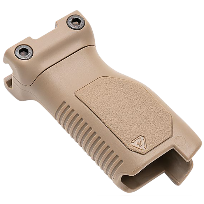 The Strike Industries Angled Vertical Grip in Flat Dark Earth offers an innovative approach to weapon handling and cable management. Crafted from durable polymer, this grip stands out with its unique 86-degree angle, ensuring a natural and comfortable hold on your firearm. The patent-pending cable management system allows you to neatly organize and store excess wires from your weapon light or other accessories, eliminating the need for makeshift solutions like cable ties. Featuring side cuts for easy pressure switch attachment, this grip enhances functionality and convenience. The Long version includes a built-in stability feature, allowing the L-shaped bottom to serve as a reliable barricade stop. Enhance your shooting precision and efficiency with this advanced accessory.