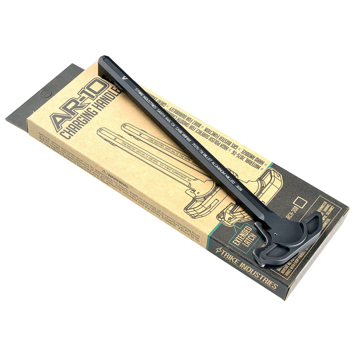 Enhance your AR10 with the Strike Industries Ambidextrous Charging Handle, crafted from robust T6 7075 aluminum. This black anodized charging handle offers an extended latch for a superior grip, ensuring smooth operation even in challenging conditions. Designed for both left and right-handed users, it combines functionality with durability, making it an essential upgrade for your firearm.