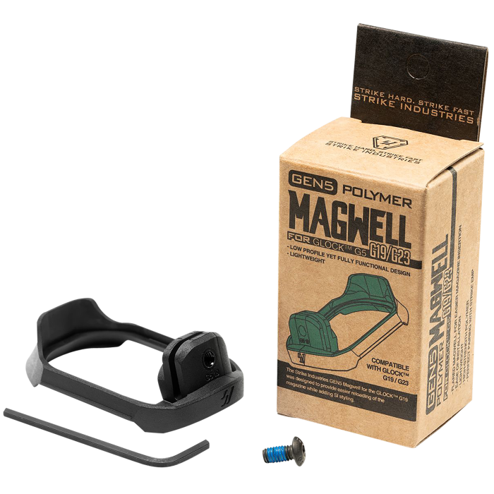 Enhance your Glock G19/23 Gen 5 with the Strike Industries Flared Magwell, crafted from durable polymer to ensure long-lasting performance. This precisely engineered accessory offers streamlined reloading with its innovative funnel-like design, minimizing reload errors. The magwell's front lip provides increased grip support without compromising the sleek factory profile of your pistol. Compatible with a variety of aftermarket magazine base plates, it's particularly suited for use with the SI Extended Magazine Plate EMP, making it a versatile addition to any shooter's arsenal. Optimize your shooting experience with this essential upgrade.