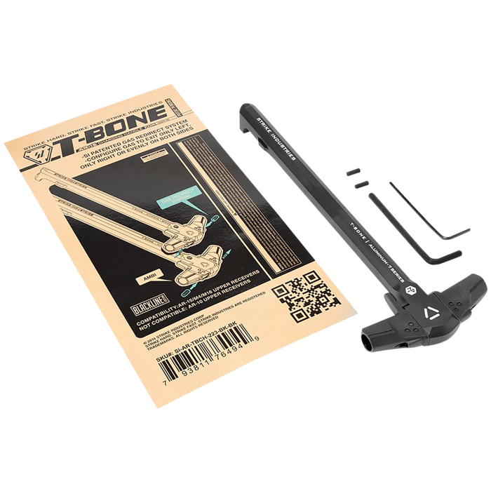 Experience enhanced control and customization with the Strike Industries T-Bone Charging Handle for .223/5.56 AR-15s. This innovative component features a patented gas redirect system, allowing you to adjust the gas flow to exit left, right, or evenly on both sides, catering to your shooting preferences. Crafted from durable 7000 series aluminum, the charging handle's shaft ensures lightweight strength, while the SI PolyFlex polymer latchless handles provide superior comfort and control. With its ambidextrous design and sleek black finish, the T-Bone Charging Handle offers a modular and efficient upgrade to your AR-15, enhancing its functionality and aesthetics.